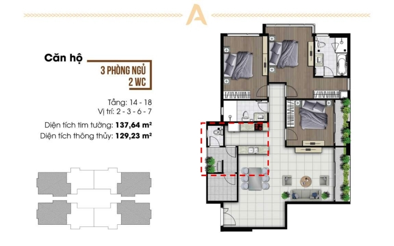 • Căn hộ tiêu chuẩn: 144 căn, diện tích từ 64 – 137m2, bố trí từ tầng 6 – tầng 18.