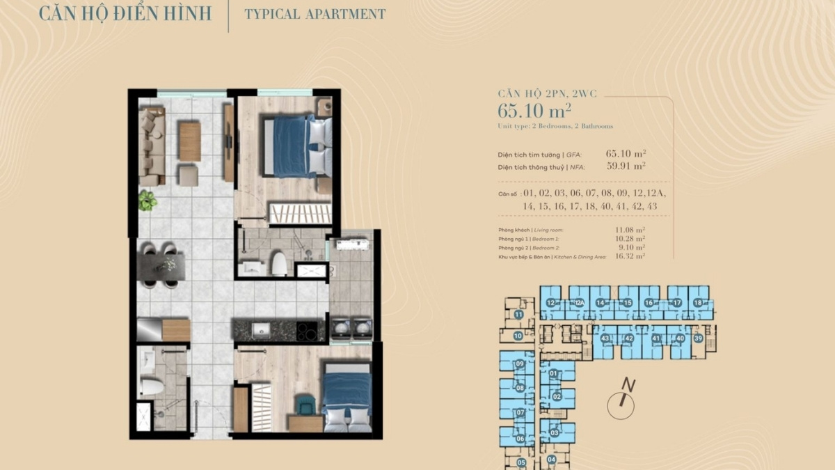 • Căn 2PN diện tích 65m2: Chiếm tỉ lệ 80%