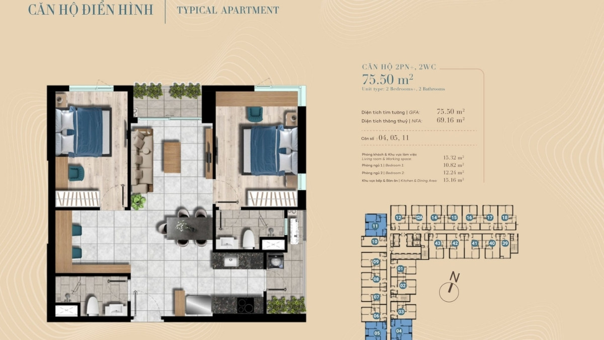 • Căn 2PN+ diện tích 75m2: Chiếm tỉ lệ 10%
