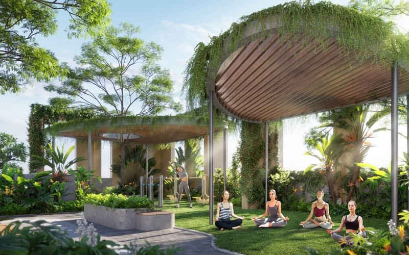 Mô hình sky amenities – tiện ích trên cao như Hồ bơi Sky View, Phòng Gym chuẩn quốc tế, khu vườn Yoga xanh mát giữa tầng không, khu vườn sinh khí, vườn trăng, vườn nghệ thuật và chòi bar.