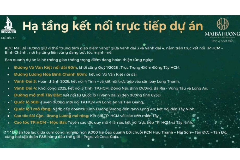 Tandoland là đơn vị có kinh nghiệm chuyên sâu và uy tín trong lĩnh vực đầu tư, phát triển hạ tầng công nghiệp và khu dân cư, đặc biệt được biết đến với dự án lớn là Khu công nghiệp Tandoland (quy mô 250 ha) liền kề. Việc Công ty Mai Bá Hương cùng Tandoland phát triển dự án này thể hiện sự hợp lực mạnh mẽ, trong đó MBH đóng vai trò quan trọng trong việc đưa dự án ra thị trường và tối ưu hóa các dịch vụ thương mại, đảm bảo KDC Mai Bá Hương không chỉ là nơi an cư mà còn là một khu đô thị hoàn chỉnh, sầm uất.