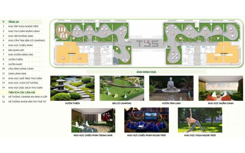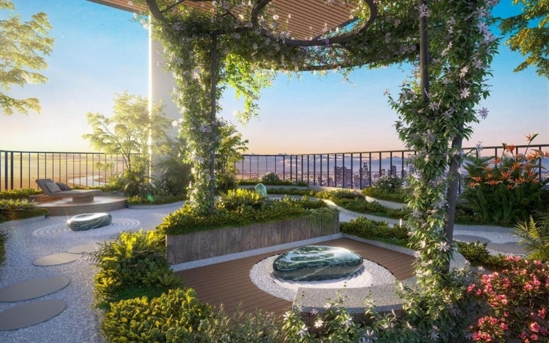 Mô hình sky amenities – tiện ích trên cao như Hồ bơi Sky View, Phòng Gym chuẩn quốc tế, khu vườn Yoga xanh mát giữa tầng không, khu vườn sinh khí, vườn trăng, vườn nghệ thuật và chòi bar.