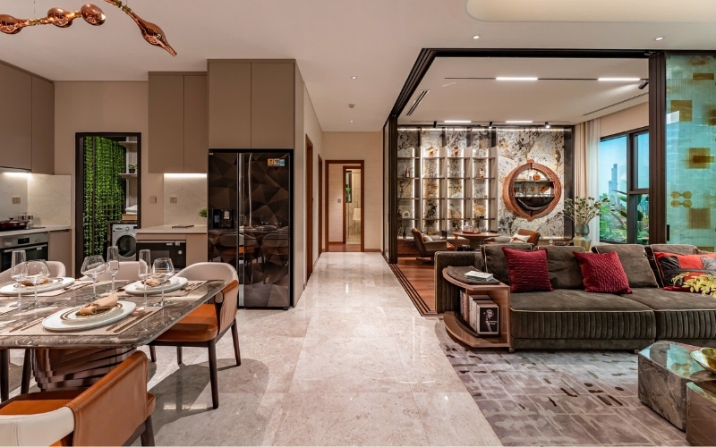 Các không gian trong nhà được bài trí sang trọng, với phòng khách thông với ban công lớn để thường xuyên đón gió trời. Đặc biệt, phòng ngủ master hay phòng ngủ thường đều được thiết kế với cửa sổ lớn hướng ra ngoài, giúp phòng vừa có không gian mở, vừa có thể ngắm cảnh về đêm.