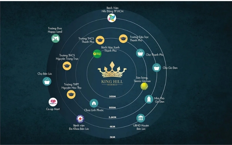 Nhờ vị trí đắc địa tại Bến Lức, liền kề TP.HCM, King Hill Residences tận hưởng lợi thế kết nối vượt trội đến chuỗi tiện ích ngoại khu đã phát triển và phong phú. Chỉ trong vài phút di chuyển, cư dân có thể tiếp cận mọi nhu cầu thiết yếu: