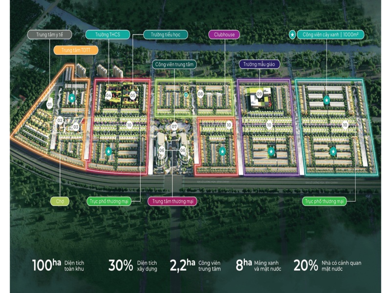 | Tiện ích | Công viên trung tâm, khu trung tâm TDTT, Khu TTTM, Clubhouse, trung tâm y tế, chợ, một số công viên nhỏ trong khu dân cư và 7 kênh thiên nhiên. |