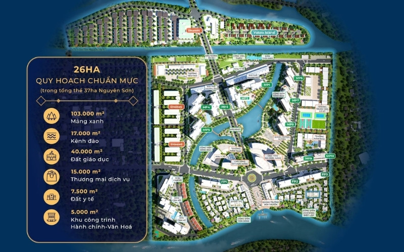 Dự án sở hữu hơn 103.000m² mảng xanh cùng 17.000m² kênh đào bao bọc, tạo nên khung cảnh nên thơ và mang lại lợi ích vô giá về sức khỏe, tinh thần cho cư dân.