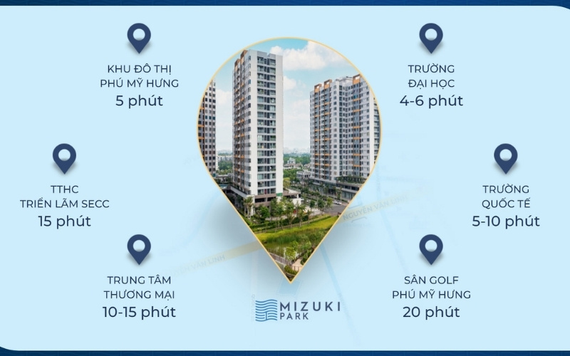 • Hạ tầng tương lai: Vị trí Mizuki Park sẽ còn gia tăng giá trị đáng kể khi các công trình giao thông trọng điểm hoàn thành, bao gồm cầu Thủ Thiêm 4 (nối Quận 7 sang Quận 2), cầu Nguyễn Khoái (nối Quận 7 sang Quận 4), và tuyến Metro số 4, giúp cư dân liên kết nhanh chóng đến các quận trung tâm và khu vực Thủ Thiêm, tạo thành mạng lưới giao thông thông suốt, hiện đại.