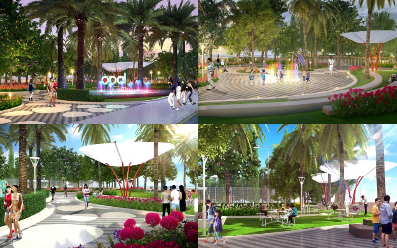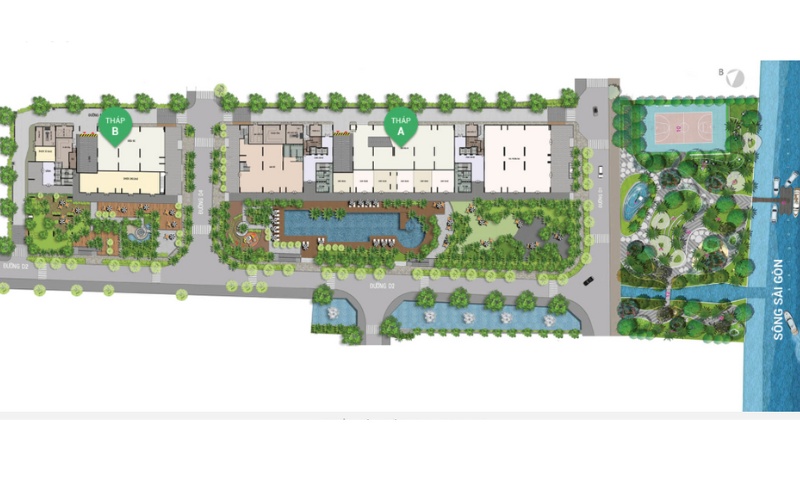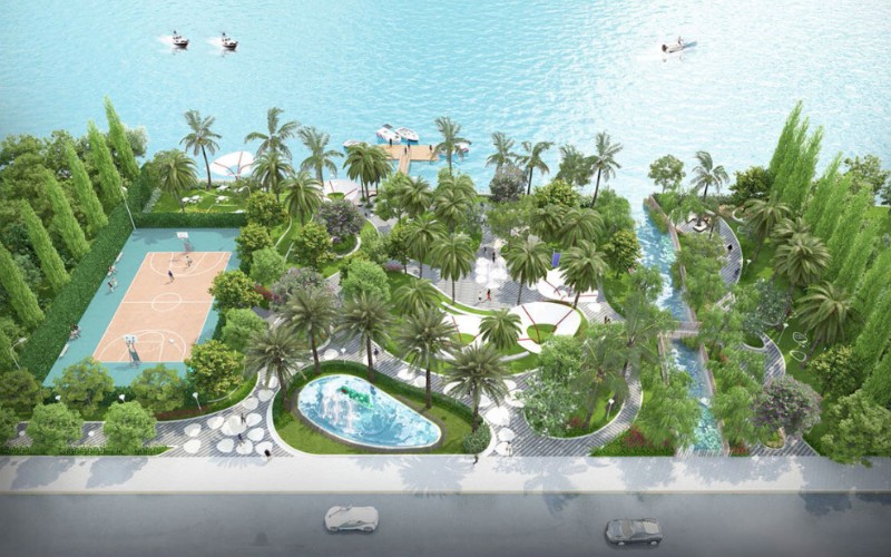 Toàn khu bao quanh bởi cây xanh, nổi bật với công viên ven sông 1ha, hồ bơi tiêu chuẩn quốc tế rộng 455 m2, sân bóng rổ, quảng trường và bến du thuyền.