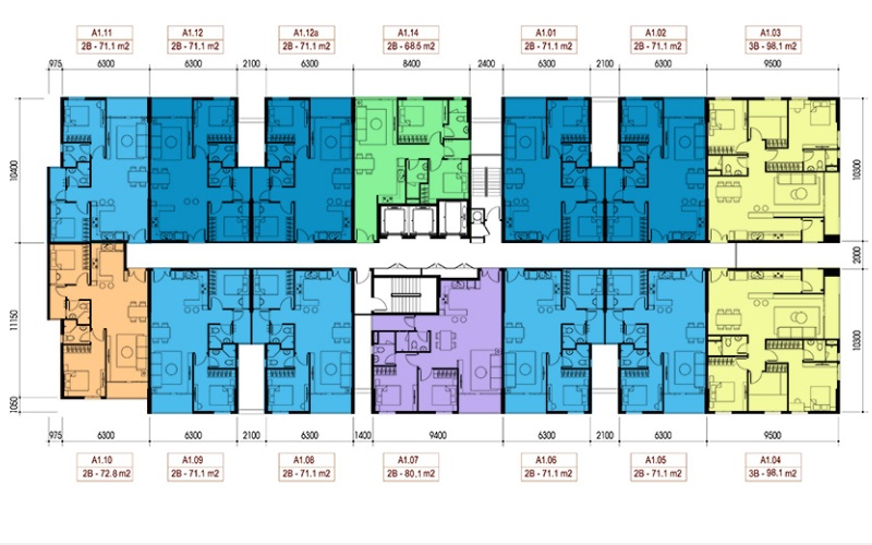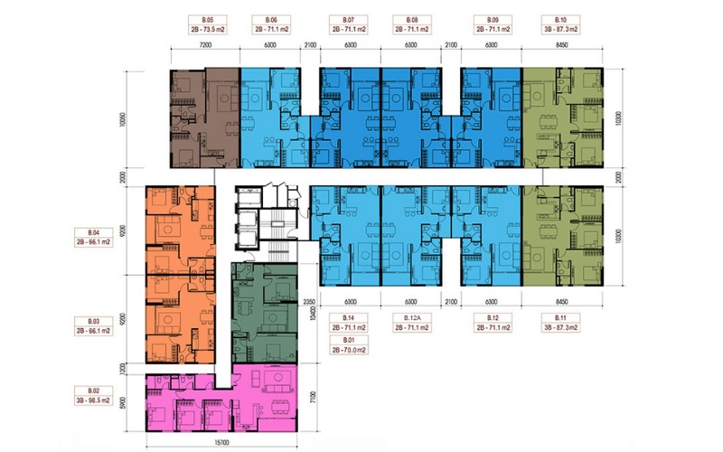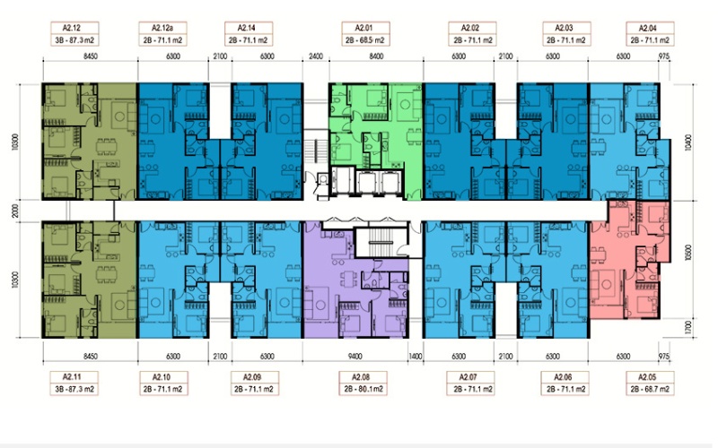 Căn hộ 2 Phòng ngủ: 67,9 m2, 68,7 m2, 71,1 m2, 72,7 m2, 79,8 m2.