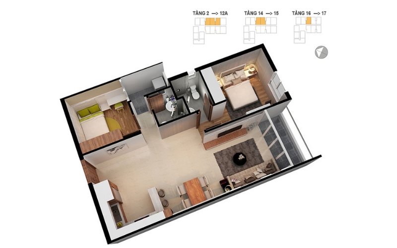 Không gian Mở: Căn hộ được tối ưu hóa diện tích sử dụng và mang lại sự riêng tư, với lối kiến trúc mở giúp xóa nhòa cảm giác về diện tích.