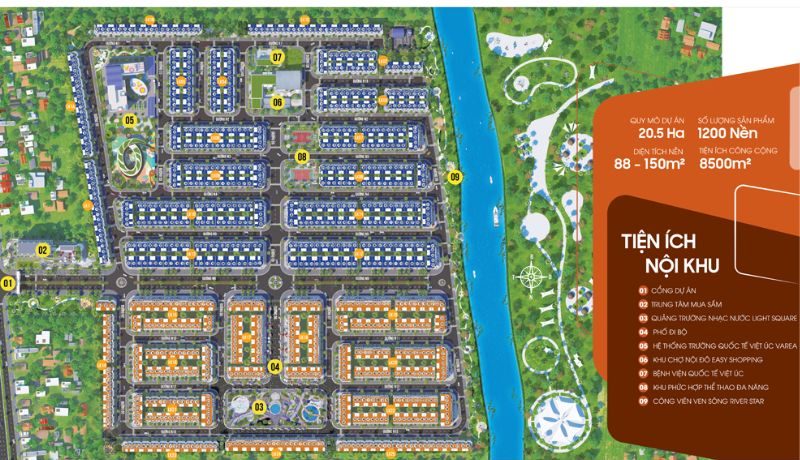 Mật độ xây dựng thấp chỉ 41% diện tích trên tổng quy mô, diện tích còn lại được dành cho các công trình tiện ích công cộng, mảng xanh sinh thái, hệ thống giao thông nội khu rộng rãi và các không gian công viên ven sông. Tất cả những điều này tạo nên một tổng thể kiến trúc hài hòa, cân bằng giữa thiên nhiên và đô thị, mang đến cho cộng đồng.