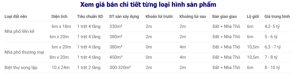 | Loại hình sản phẩm | Shophouse, nhà phố, biệt thự, căn hộ cao tầng… |